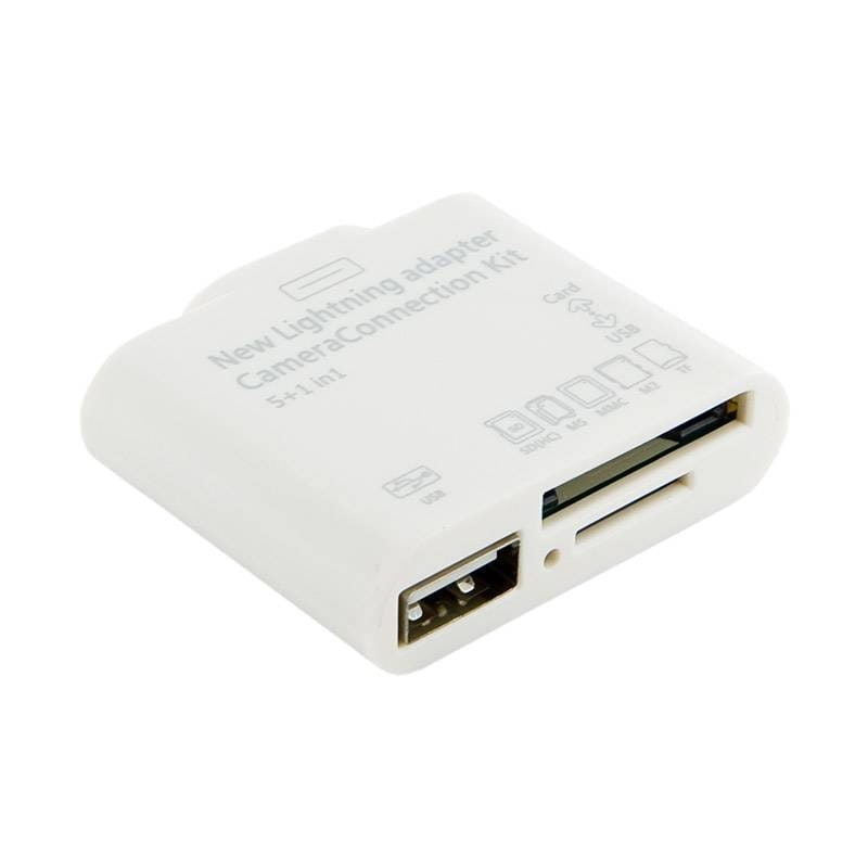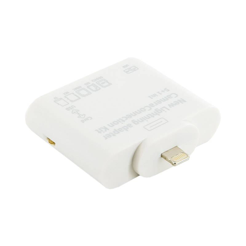 New Lightning adapter CameraConnection Kit 5+1 in 1 to czytnik kart pamięci ze złączem USB w kolorze białym markiDeLock. Jest to czytnik zewnętrzny dedykowany dla Apple iPhone 5 / iPad 4 / iPad mini. Obsługuje 5 typów kart pamięci, wśród których najpopularniejszymi są SecureDigital, Memory Stick czy MultiMediaCard. Urządzenie wspiera technologię Plug & Play.