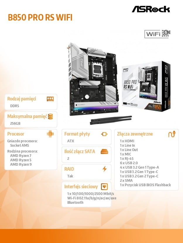 ASRock Płyta główna B850 PRO RS WIFI AM5 4DDR5 ATX