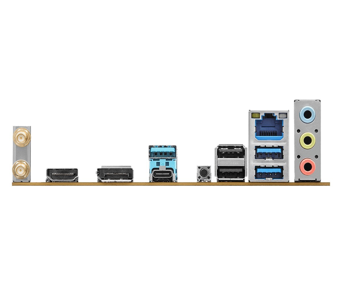 Złącza zewnętrzne: 1 x Line In, 1 x DisplayPort, 2 x USB 2.0, 2 x SMA, 1 x Przycisk BIOS Flash, 1 x USB 3.2 Gen 2 Type-C, 1 x Głośnik centralny / Subwoofer, 3 x USB 3.0, 1 x MIC, 1 x HDMI, 1 x RJ-45
