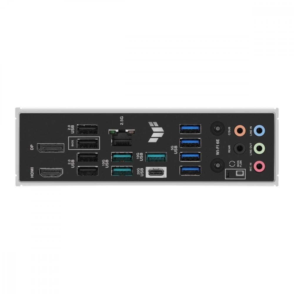 Złącza zewnętrzne: 1 x USB 3.2 Gen 2x2 Type-C, 1 x Przycisk BIOS Flash, 1 x RJ-45, 1 x HDMI, 1 x Line Out, 1 x MIC, 1 x Line In, 4 x USB 2.0, 1 x Wi-Fi Module, 1 x Głośnik tylny, 1 x Głośnik centralny / Subwoofer, 1 x DisplayPort, 3 x USB 3.2 Gen 2 Type-A, 4 x USB 3.2 Gen 1 Type-A
