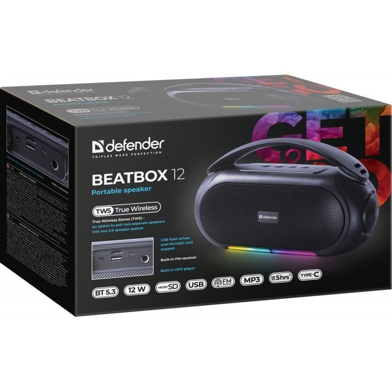 Przenośny głośnik Beatbox 12. Mocny przenośny głośnik z Bluetooth 5.3, podświetleniem LED, wbudowanym odtwarzaczem MP3 i tunerem FM. Obsługa dysków flash i kart pamięci microSD.