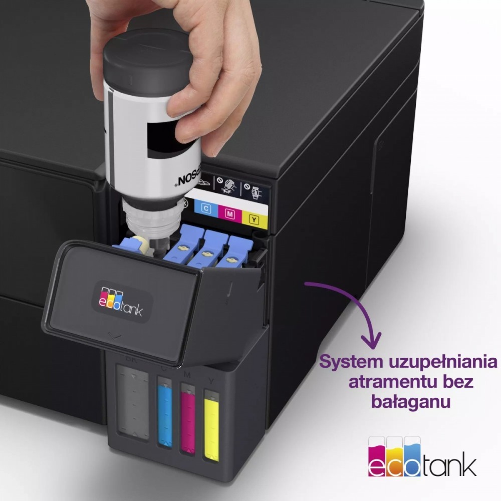 - Prosty, bezproblemowy system stałego zasilania w atrament pozwala na uzupełnianie zbiorników z butelek System butelek z blokadą EcoTank zapewnia czystość
