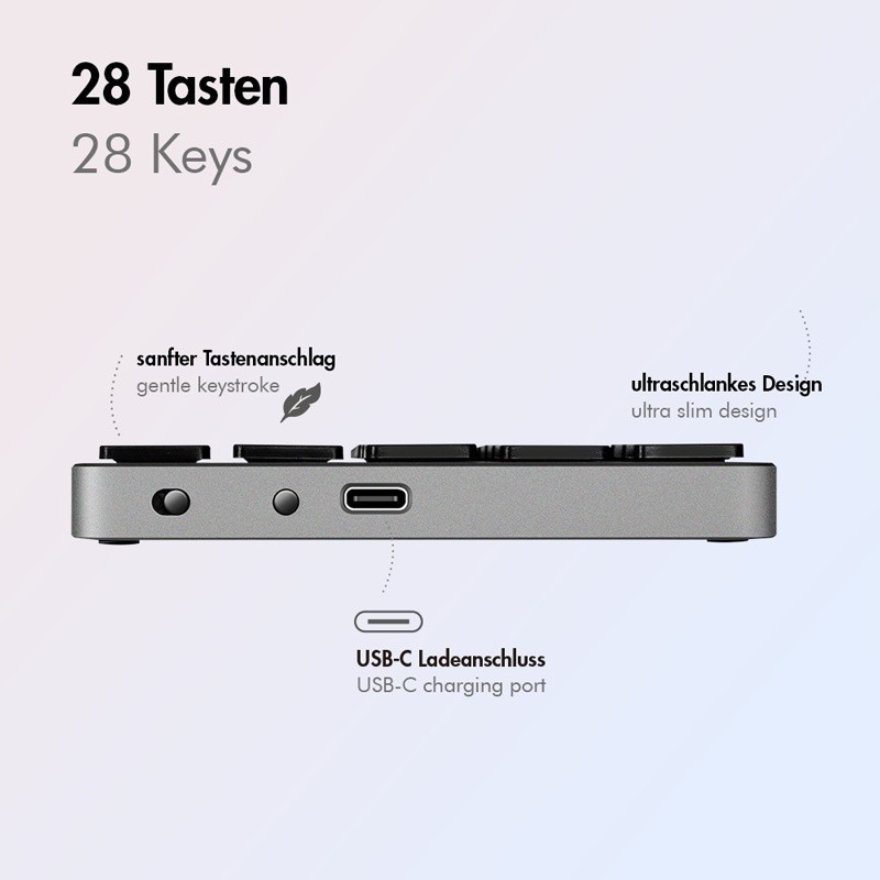 Ułatw sobie wprowadzanie danych dzięki wielofunkcyjnej klawiaturze numerycznej z 28 klawiszami. Dzięki BT 5.0 oferuje stabilne połączenie nawet do 10 metrów. Mechanizm nożycowy i niskoszumowe klawisze zapewniają komfortowe i ciche pisanie. Dzięki funkcjom NumLock, ESC, Delete oraz klawiszowi kalkulatora jest idealna do księgowości, arkuszy kalkulacyjnych w Excelu lub Google Sheets oraz ogólnego wprowadzania danych. Zintegrowana bateria 140 mAh oferuje długi czas pracy i może być wygodnie ładowana za pomocą USB-C.