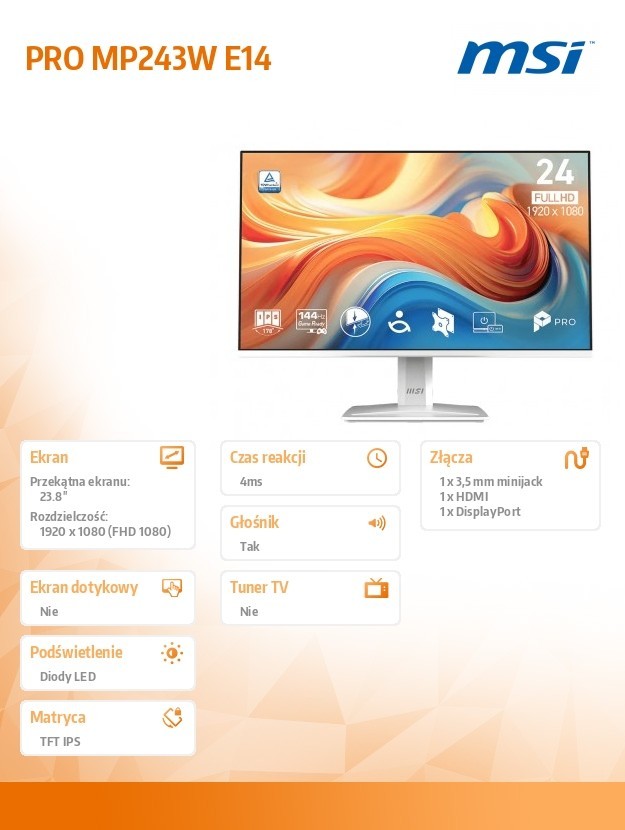 MSI Monitor PRO MP243W E14 23.8 cala LED/FHD/FLAT/144Hz/biały