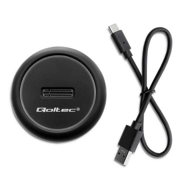Stacja jest kompatybilna z dyskami M.2 o interfejsie SATA oraz NVMe. Oferuje szybkość transmisji danych do 10 Gb/s. Dodatkowo stacja dysków marki Qoltec to urządzenie: