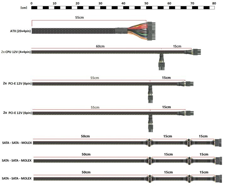 - 4x złącze PCI-E 6+2pin (na 2 kablach o dł. 55+15cm, flat black)