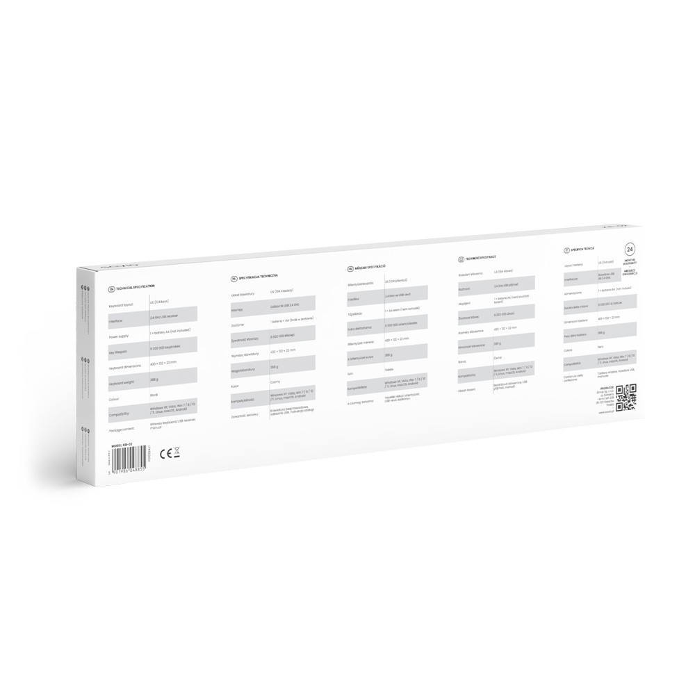 Pozostałe parametry: Specyfikacja techniczna: Układ klawiatury: US (104 klawiszy) Interfejs: Odbiornik USB 2.4 GHz Zakres częstotliwości, w którym pracuje urządzenie radiowe: 2400 MHz 2483.5 MHz Maksymalna moc częstotliwości radiowej emitowanej w zakresie częstotliwości, w której pracuje urządzenie radiowe: 4 dBm Zasilanie: 1 bateria × AA (brak w zestawie) Żywotność klawiszy: 8 000 000 kliknięć Kompatybilność: Windows XP, Vista, Win 7 / 8 / 10 / 11, Linux, macOS, Android