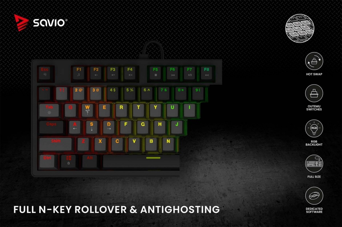 Klawiatura Savio STYX została wyposażona w technologię N-key rollover czyli możliwość rejestracji wielu naciśnięć klawiszy jednocześnie. Dodatkowo, funkcja Anti-ghosting (czyli eliminacja błędnych sygnałów klawiszy, które nie zostały faktycznie wciśnięte) zapewnia maksymalną precyzję. Dzięki temu nawet najbardziej dynamiczne kombinacje klawiszy w grach i pracy biurowej zostaną zarejestrowane bezbłędnie.