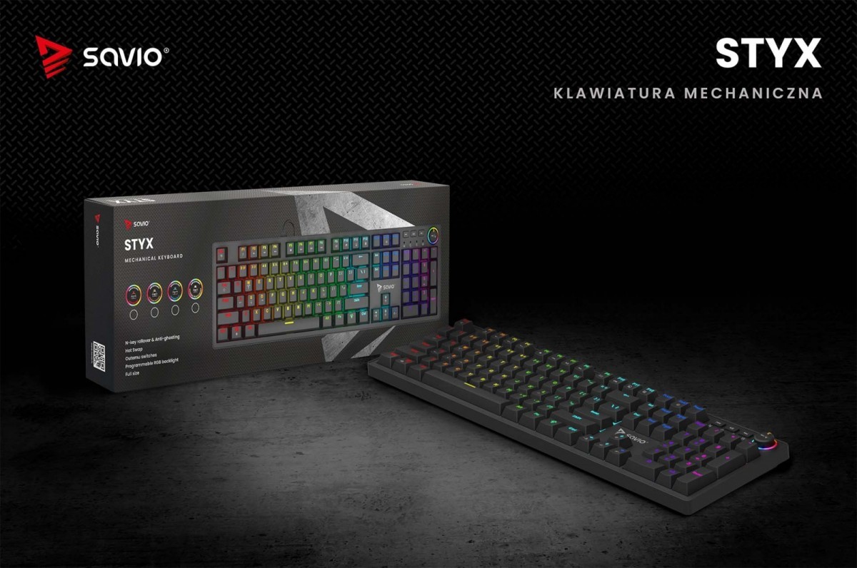 Savio STYX to klawiatura mechaniczna typu full size (pełnowymiarowa), stworzona z myślą o graczach i profesjonalistach, którzy nie uznają kompromisów. Łączy w sobie wygodę codziennego użytkowania z gamingową wydajnością i efektownym designem. Dzięki możliwości personalizacji, wysokiej trwałości i nowoczesnym funkcjom, STYX doskonale sprawdza się zarówno w rozgrywce, jak i pracy.