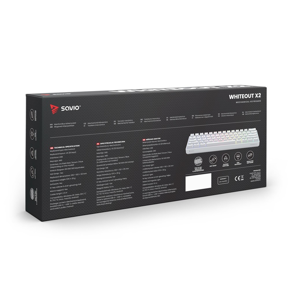 Whiteout X2 wyposażono w dedykowane oprogramowanie, dzięki któremu możesz dostosować funkcje, efekty świetlne i inne ustawienia przycisków, aby klawiatura była idealnie dopasowana do Twoich indywidualnych potrzeb. Osiągnij pełną kontrolę nad swoją grą oraz wejdź na wyższy poziom gamingu z Savio.