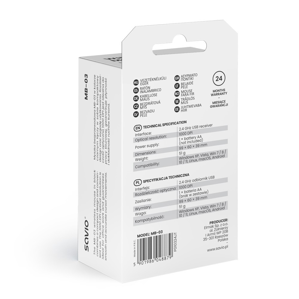 Mysz bezprzewodowa Savio MB-03 jest kompatybilna z szeroką gamą systemów operacyjnych, takich jak Windows XP, Vista, 7, 8, 10, 11, Linux, macOS oraz Android, dzięki czemu można ją bez problemu używać na różnych urządzeniach.