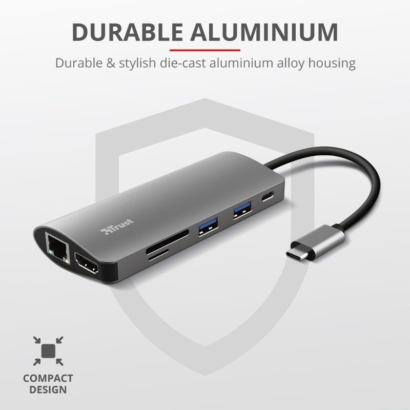 - Jeśli jesteś w ciągłym ruchu, Trust Dalyx 7-w-1 Adapter nie spowolni Cię ani trochę. Niewielki rozmiar w połączeniu z solidną aluminiową obudową oznacza, że zabierzesz go wszędzie. Nie wymaga dodatkowego zasilania, a gdy jesteś na sesji zdjęciowej lub nawet na wakacjach, dołączony czytnik kart zapewni, że możesz bezproblemowo tworzyć kopie zapasowe zdjęć.